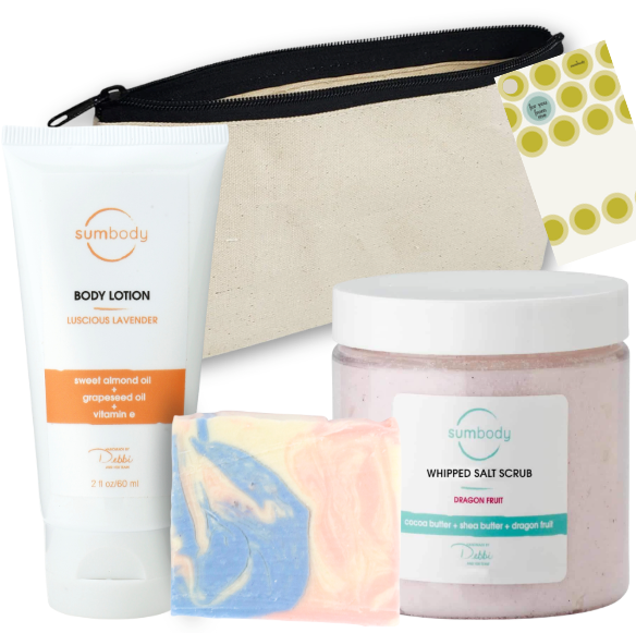 PEACE LOVE AND RELAXATION SET CONTAINS:  2oz Lavender Lotion Lotion, Peace & Love Soap, Dragon Fruit Salt Scrub, plus a travel mini cleanser